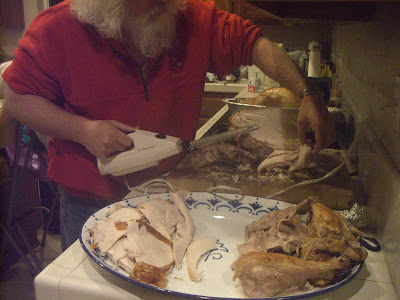 Here is Grandpa carving the turkeys, yes we had two, and left a little for leftovers, but some thought not enough leftovers.
